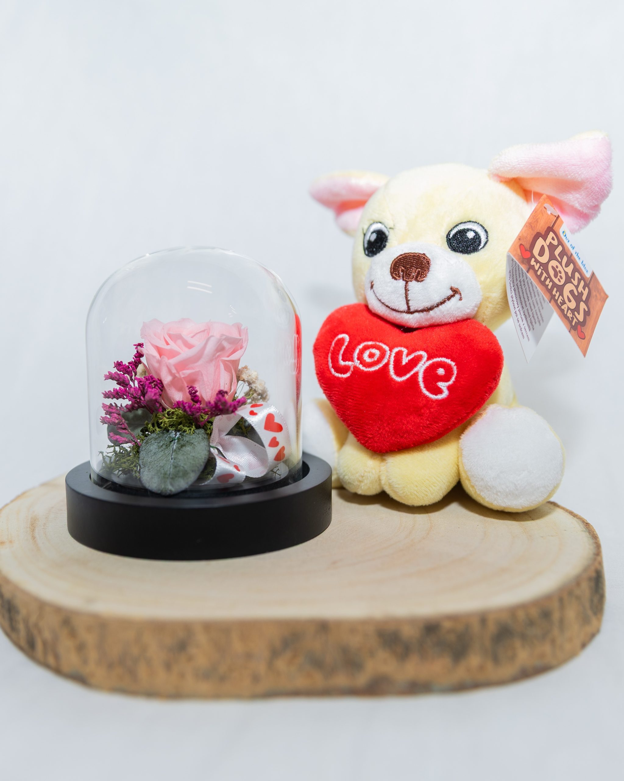 Peluche perrito varios modelos con base de madera y cúpula con rosa preservada