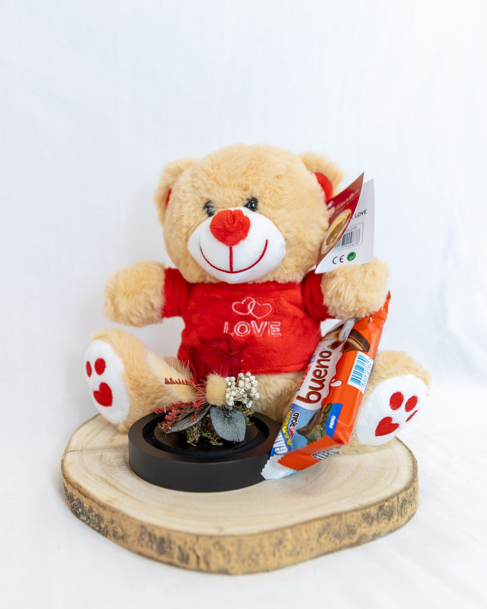OSITO CON ROSA EN CÚPULA Y BASE MADERA