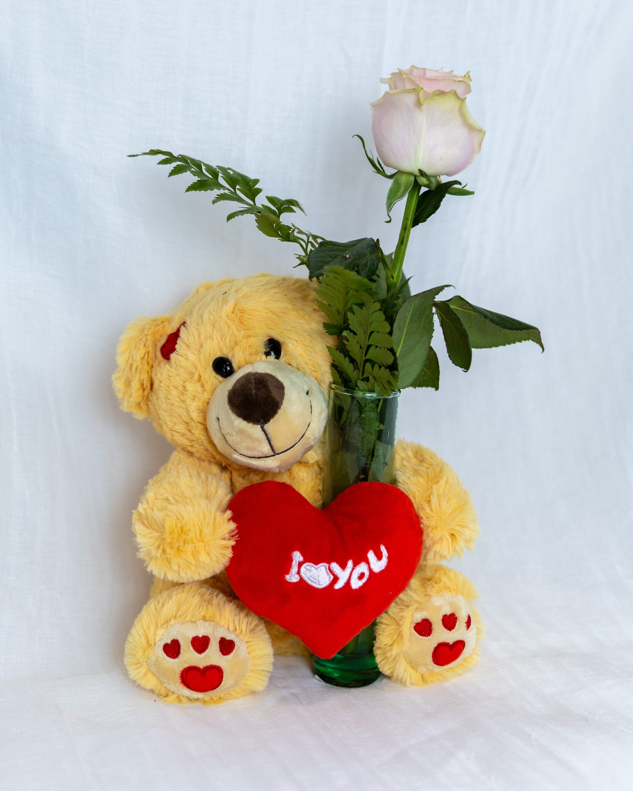 Peluche oso corazón con jarrón y rosa